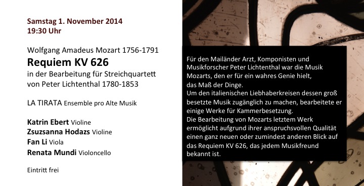 Für den Mailänder Arzt, Komponisten und Musikforscher Peter Lichtenthal war die Musik Mozarts, den er für ein wahres Genie hielt, das Maß der Dinge. Um den italienischen Liebhaberkreisen dessen groß besetzte Musik zugänglich zu machen, bearbeitete er einige Werke für Kammerbesetzung. Die Bearbeitung von Mozarts letztem Werk ermöglicht aufgrund ihrer anspruchsvollen Qualität einen ganz neuen oder zumindest anderen Blick auf das Requiem KV 626, das jedem Musikfreund bekannt ist.