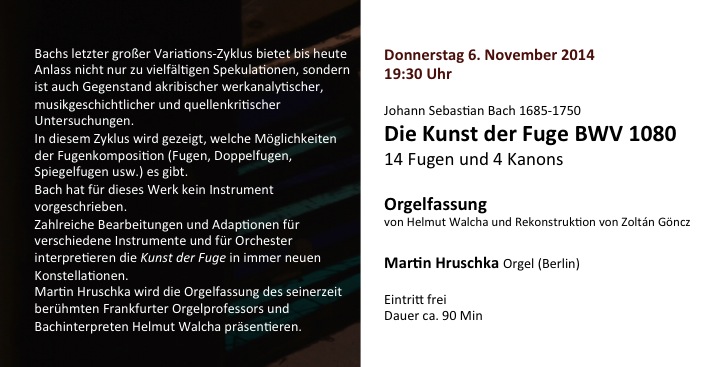Bachs letzter großer Variations-Zyklus bietet bis heute Anlass nicht nur zu vielfältigen Spekulationen, sondern ist auch Gegenstand akribischer werkanalytischer, musikgeschichtlicher und quellenkritischer Untersuchungen. In diesem Zyklus wird gezeigt, welche Möglichkeiten der Fugenkomposition (Fugen, Doppelfugen, Spiegelfugen usw.) es gibt. Bach hat für dieses Werk kein Instrument vorgeschrieben. Zahlreiche Bearbeitungen und Adaptionen für verschiedene Instrumente und für Orchester interpretieren die Kunst der Fuge in immer neuen Konstellationen. Martin Hruschka wird die Orgelfassung des seinerzeit berühmten Frankfurter Orgelprofessors und Bachinterpreten Helmut Walcha präsentieren.