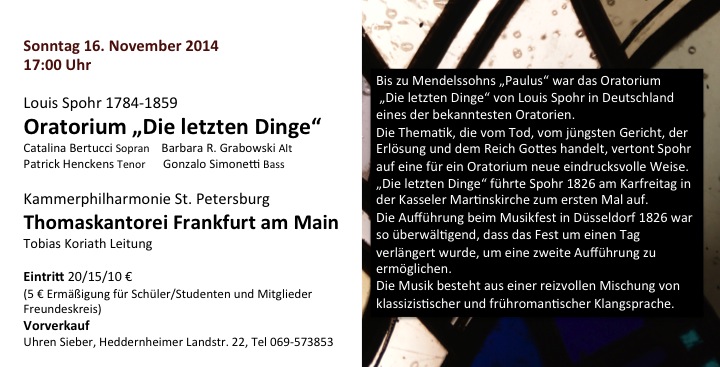 Die Aufführung des groß besetzten Oratoriums "Die letzten Dinge" von Louis Spohr durch die Thomaskantorei Frankfurt am Main bildet den Mittelpunkt der Veranstaltungsreihe "Novissima". Eine detaillierte Einführung in das Oratorium gibt der Eröffnungsvortrag von Dr. Dominik Höink. Mit den Aufführungen des Mozart-Requiems in einer Fassung für Streichquartett und von Bachs letztem großen Variationszyklus "Die Kunst der Fuge" bietet sich daneben die Möglichkeit, eine neue Klang- Perspektive auf gewohnte Hörerlebnisse zu gewinnen. Begegnen Sie den "letzten Dingen" nicht nur mit dem Ohr, sondern auch mit dem Auge: bei einer Führung im Städel-Museum mit Stadtkirchenpfarrer David Schnell oder (besonders für Familien) im Rahmen eines Kindergottesdienstes beim Besuch des Heddernheimer Friedhofes.