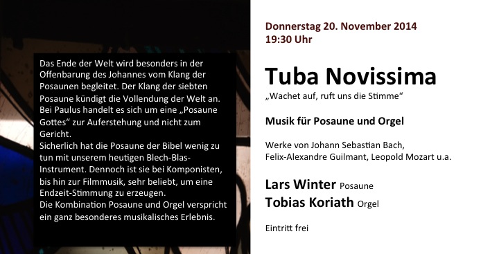 Das Ende der Welt wird besonders in der Offenbarung des Johannes vom Klang der Posaunen begleitet. Der Klang der siebten Posaune kündigt die Vollendung der Welt an. Bei Paulus handelt es sich um eine "Posaune Gottes" zur Auferstehung und nicht zum Gericht. Sicherlich hat die Posaune der Bibel wenig zu tun mit unserem heutigen Blech-Blas-Instrument. Dennoch ist sie bei Komponisten, bis hin zur Filmmusik, sehr beliebt, um eine Endzeit-Stimmung zu erzeugen. Die Kombination Posaune und Orgel verspricht ein ganz besonderes musikalisches Erlebnis.