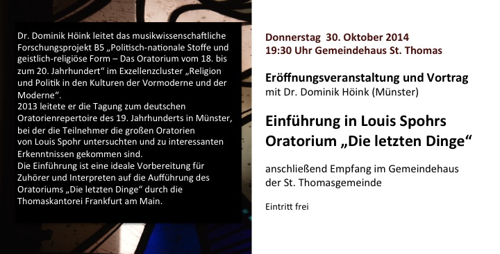 Dr. Dominik Höink ist zur Zeit ein führender Experte in Deutschland in der musikwissenschaftlichen Forschung über Louis Spohr. Er leitet das Forschungsprojekt "Politisch-nationale Stoffe und geistlich-religiöse Form – Das Oratorium vom 18. bis zum 20. Jahrhundert" in einem Exzellenzcluster der Universität Münster. Im Mittelpunkt einer Fachtagung im Jahr 2013 zum deutschen Oratorienrepertoire des 19. Jahrhunderts standen im Blick der Teilnehmenden die großen Oratorien von Louis Spohr. Dr. Höink stellt die Ergebnisse seiner Forschung und der Fachtagung in der Eröffnungsveranstaltung vor. Die Einführung ist eine ideale Vorbereitung für Zuhörer und Interpreten auf die Aufführung des Oratoriums "Die letzten Dinge" durch die Thomaskantorei Frankfurt am Main.